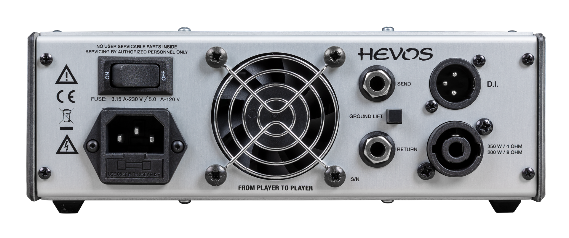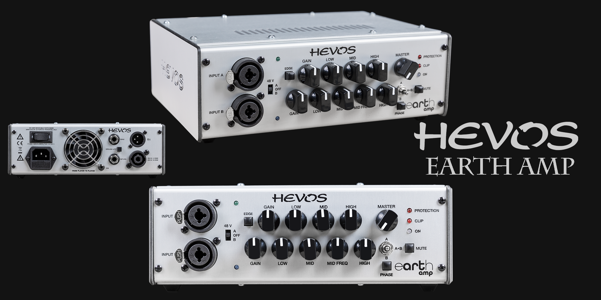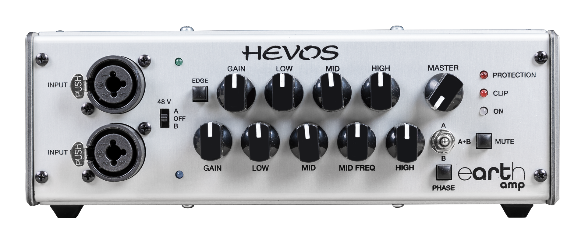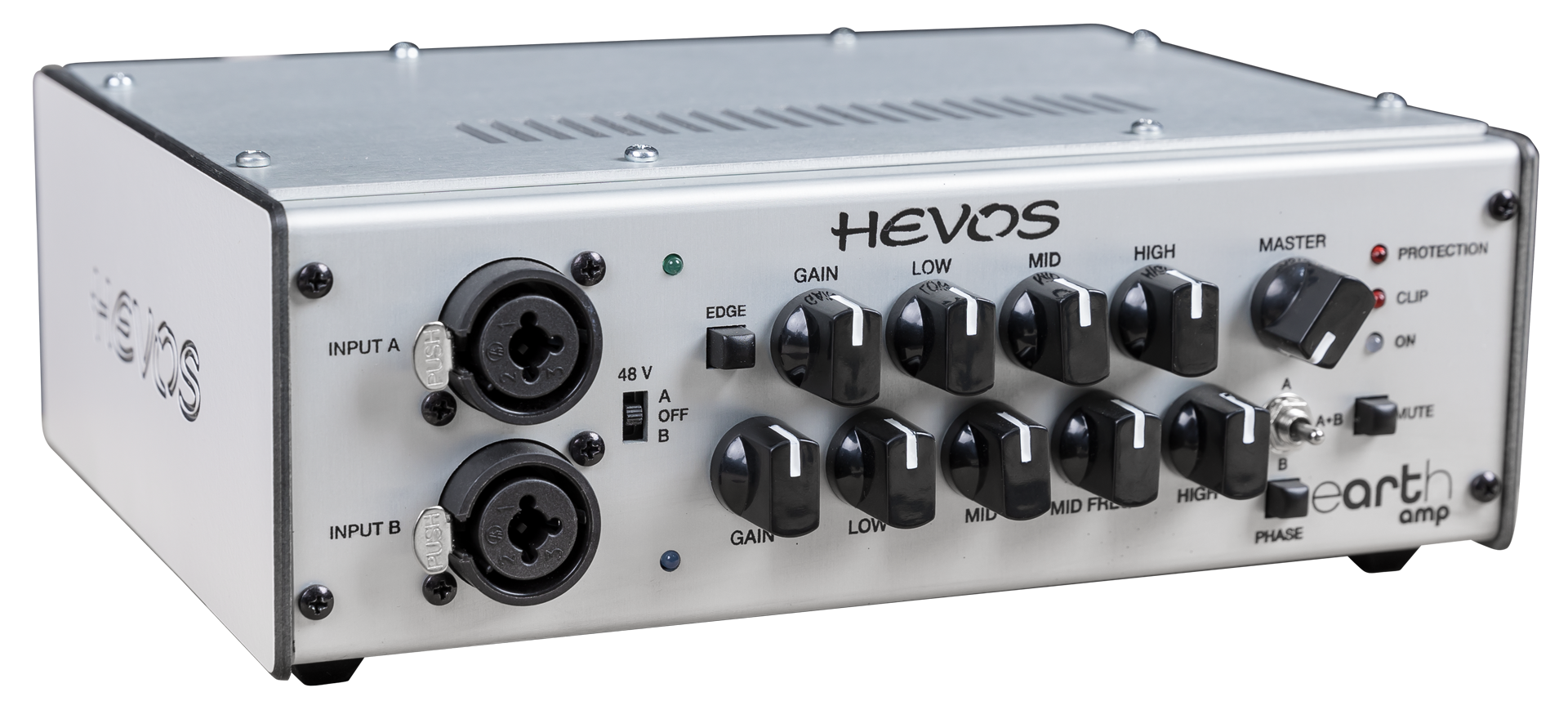 Hevos Earth Amp verfügt über alle notwendigen Werkzeuge für den professionellen Einsatz, darunter einen Phasenschalter, einen symmetrischen Line-Out mit Ground Lift, zwei leistungsstarke EQ-Sektionen mit Kanalwahlschalter, eine Flankenkorrektur Option, einen Mute Schalter sowie eine Send/Return Effektschleife.